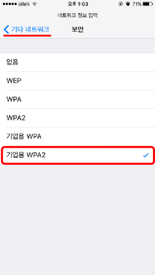 4. 보안은 <그림4>의 기업용WPA2 선택 후 <기타네트워크 를 눌러 창을 빠져나옵니다.